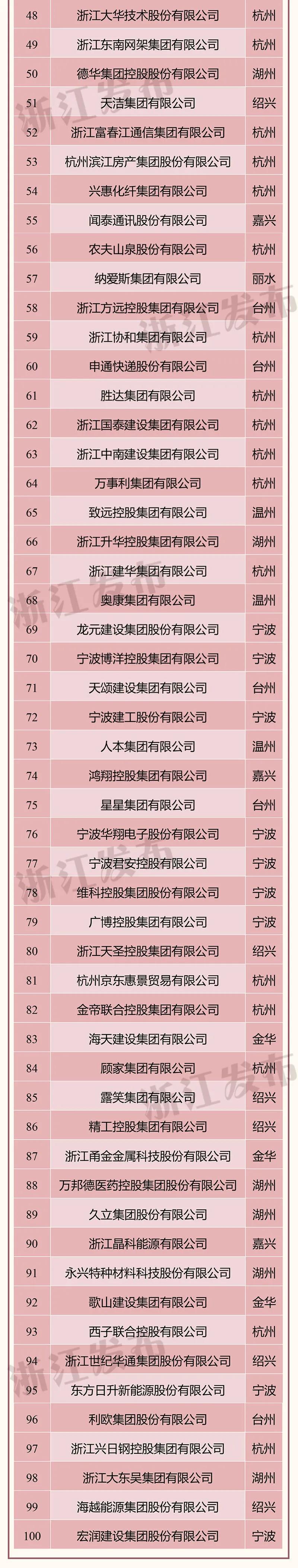 9月3日,省市场监管局、省工商联共同发布“2020浙江省民营企业100强”榜单。本次100强榜单根据企业提供的2019年度财务报表,以企业2019年度营业收入为主要依据,参考其当年净利润、净资产、纳税额等指标以及企业信用信息公示系统年报数据等进行排序。