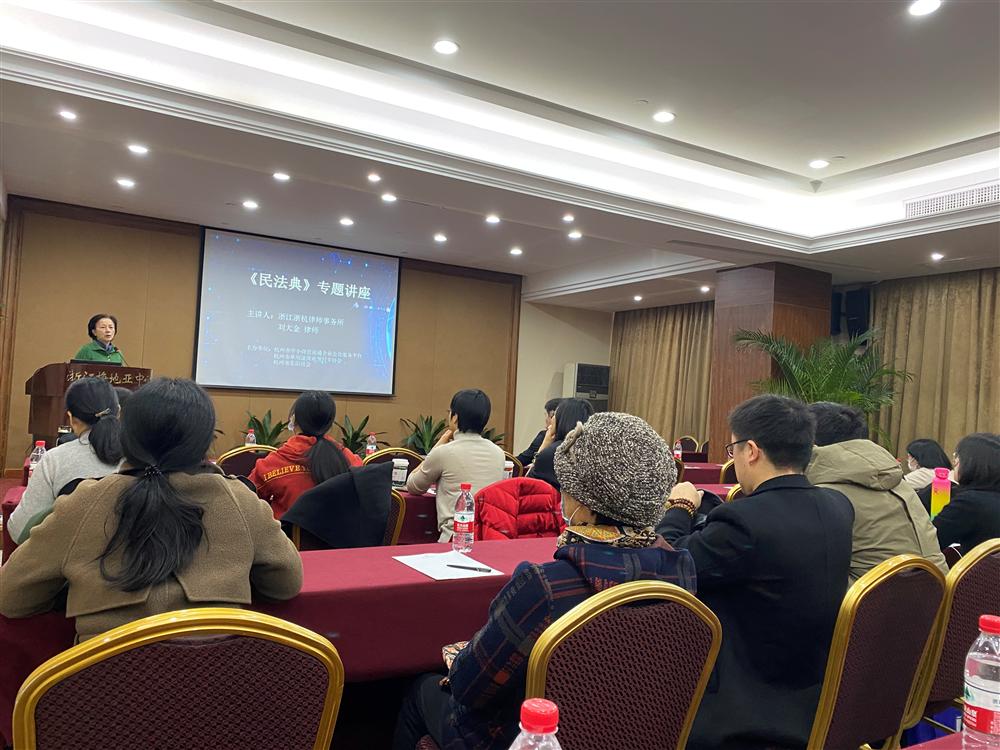 12月1日,杭州市东阳商会为了深入学习贯彻习近平总书记广泛开展《民法典》普法工作的指示精神,切实做好《民法典》的普法工作,与杭州市中小商贸流通企业公共服务平台、杭州市单用途商业预付卡协会联合在梅地亚宾馆星光厅举行了《民法典》专题讲座活动,参加本次《民法典》学习的有50多人。讲座由杭州市单用途商业预付卡协会秘书长邵华主持。