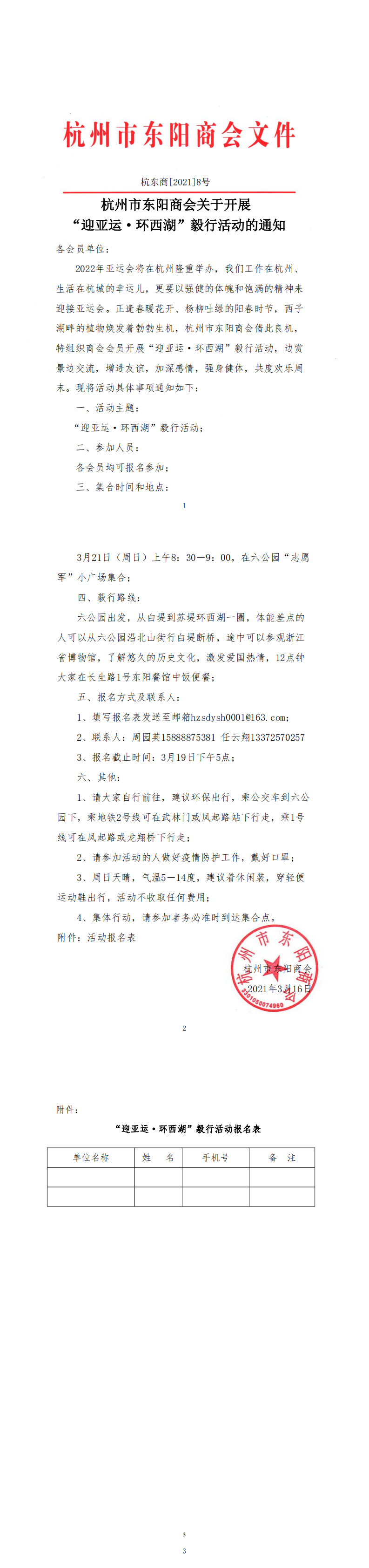 杭州市东阳商会关于开展“迎亚运·环西湖”毅行活动的通知