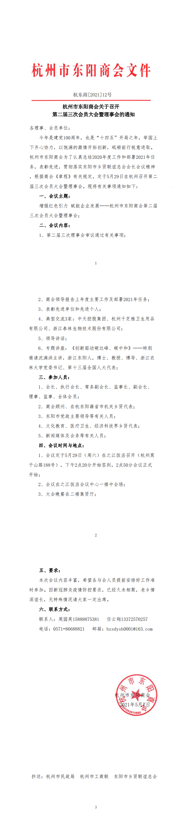 杭州市东阳商会关于召开第二届三次会员大会暨理事会的通知