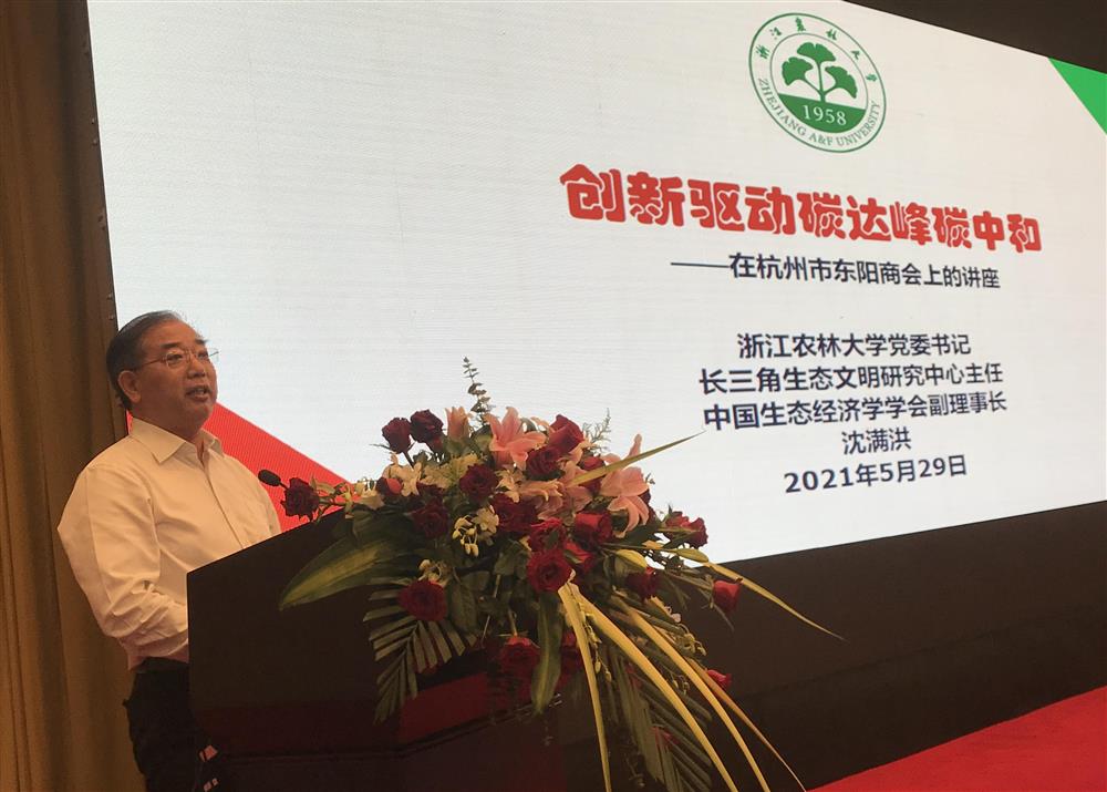 大会特别邀请了东阳优秀乡贤、浙江农林大学党委书记、博导、沈满洪教授作《创新驱动碳达峰碳中和》专题讲座。沈教授主要从三个方面作了深入浅出的分享:一是碳达峰碳中和的基本概念,解析了碳源与碳汇、高碳发展与低碳发展、绿色发展、循环发展与低碳发展;二是碳达峰碳中和的若干争议,涉及到科学问题、制度问题和公平问题;三是碳达峰碳中和的创新体系,包括低碳能源创新、产业创新、社区创新、生态创新、碳市场创新等等。沈满洪一个小时的精心分享,会场内多次报以热烈的掌声,既专业又生动的讲座使大家脑洞大开,受益匪浅,得到与会人员的一致好评。