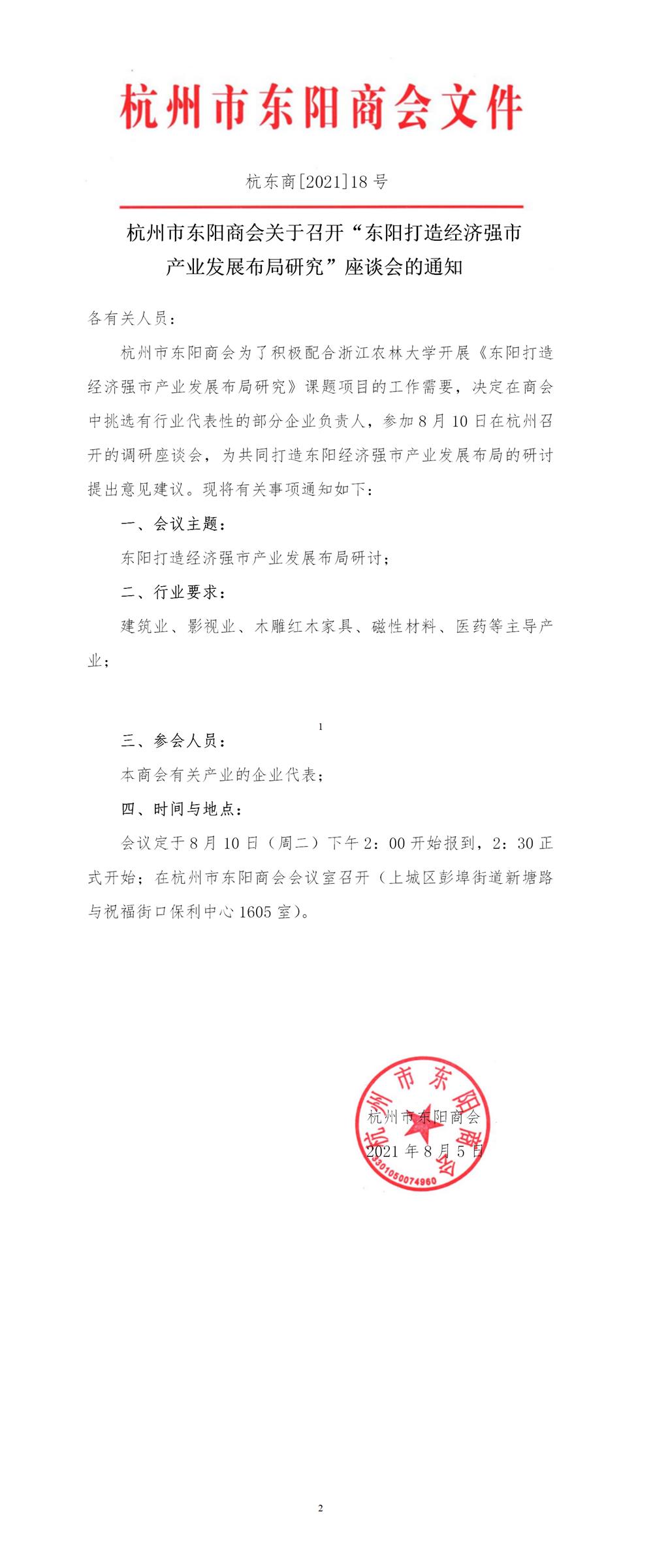 杭州市东阳商会关于召开“东阳打造经济强市 产业发展布局研究"座谈会的通知