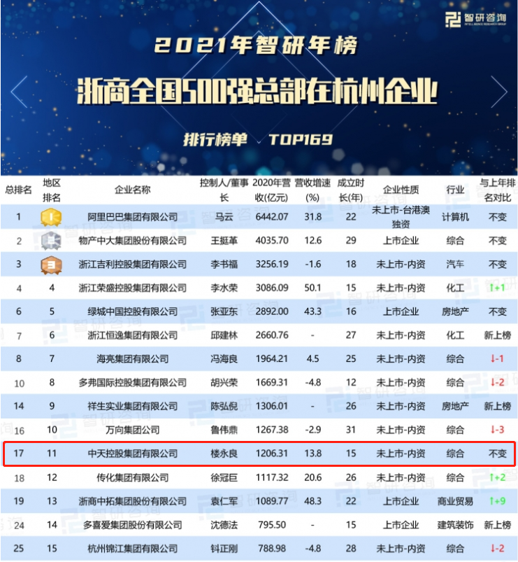 日前,根据浙商企业2020年营收额的排名,《浙商杂志》正式了发布榜单。令人欣喜的是杭州市东阳商会有8家会员企业荣登“2021浙商全国500强”排行榜!其中,中天控股集团有限公司排名第17位、花园集团有限公司排名第66位(较上一年上升2位)进入前100强,歌山建设集团有限公司位列123位、赞宇科技集团股份有限公司位列185位(这两家公司较上一年各上升1位)、康恩贝集团有限公司位列213位、浙江健盛集团股份有限公司位列430位、浙江华铁应急设备科技股份有限公司位列436位(较2020年上升19位),今年新上榜的杭州立昂微电子股份有限公司位列439位。
