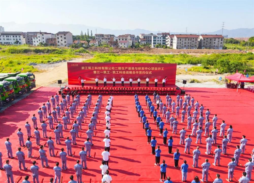 2021年9月1日上午,杭州市东阳商会副会长浙江筑工科技有限公司二期生产基地与研发中心项目开工暨三一筑工与筑工科技战略合作签约仪式在公司二期施工现场隆重举行。金华市住房和城乡建设局副局长徐春来,三一集团有限公司副总裁马荣全,东阳市委常委、常务副市长陈洪,东阳市委常委、宣传部长陈小华,东阳市住房和城乡建设局局长韦健,金华市住房和城乡建设局建筑业管理处处长吴军峰,东阳市江北街道党工委书记王赛锋,朗诗地产副总裁刘守伟,浙江旭业工程设备有限公司董事长银悝,浙江筑工科技有限公司董事长杜德韩等相关领导、嘉宾参加,开发区党工委书记、管委会主任黄文明主持开工仪式。