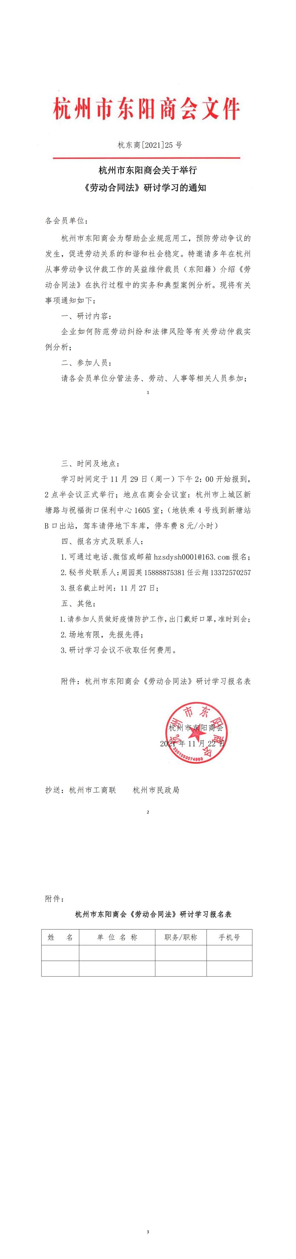 杭州市东阳商会关于举行《劳动合同法》研讨学习的通知