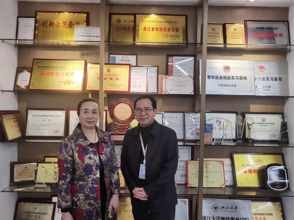 万朋科技创建于2003年,始创人申屠祖斌结合之前8年致力于教育管理软件研发的成功经验和他前瞻性的眼光,开辟了中国第一个网络互动教学平台——课后网(www.kehou.com),搭建“空中课堂”,在区域内实现名师共享,师生实时在线互动,现已成为引领中国智慧教育信息化发展的佼佼者。万朋科技在全国各大城市设有110多个办事处,驻地工作人员达400多人,杭州总部员工300多人,技术力量雄厚。当申屠祖斌陪同秘书处人员参观展示厅时,映入眼帘是数不胜数的荣誉证书、奖杯、专利证书、感谢信,还有占据一面大墙的全国在线教育实时数据屏幕……