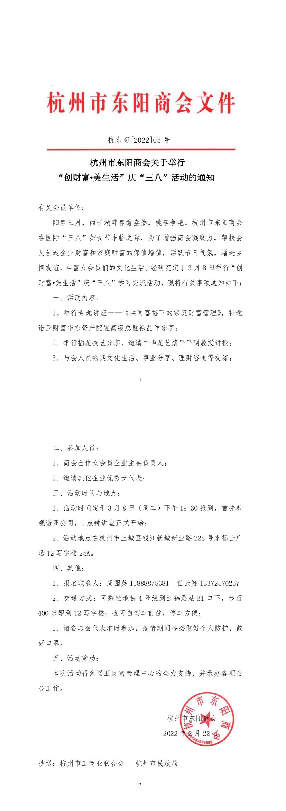 杭州市东阳商会关于举行 “创财富 美生活”庆“三八”活动的通知