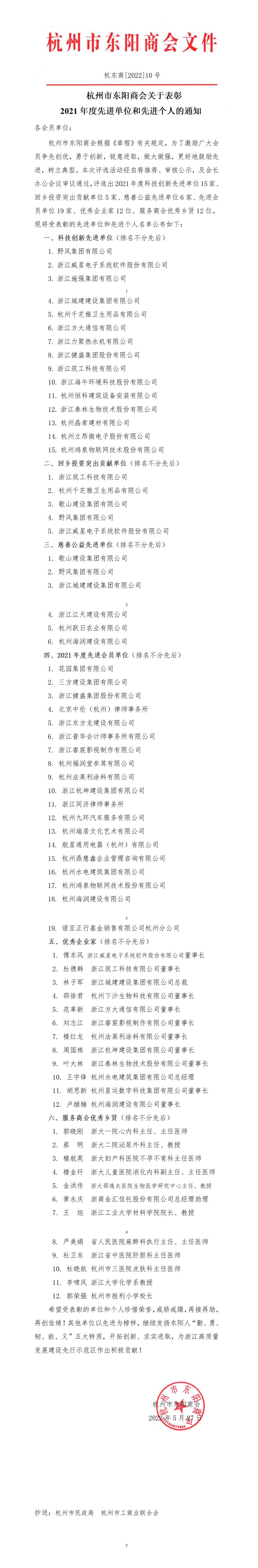 杭州市东阳商会关于表彰2021年度先进单位和先进个人的通知