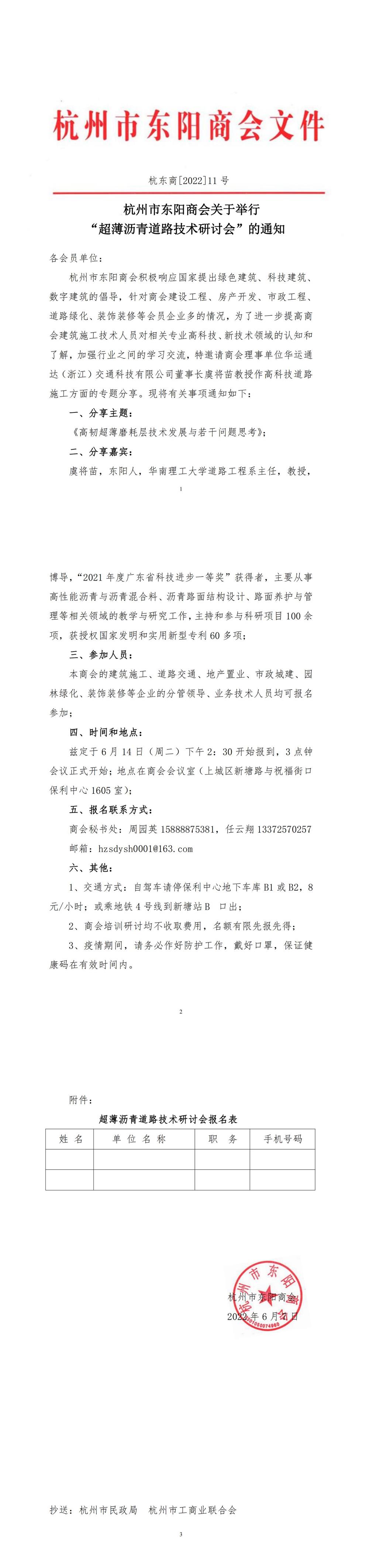 杭州市东阳商会关于举行“超薄沥青道路技术研讨会”的通知