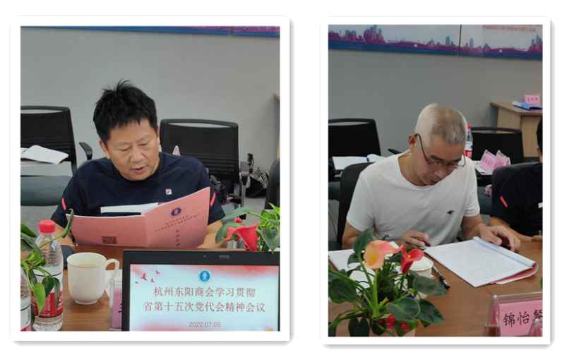 7月5日下午,杭州市东阳商会组织会员企业传达学习贯彻省第十五次党代会精神,与会人员人人参与,原原本本地认真通读了省第十五次党代会省委书记袁家军所作的大会报告,会议就全面学习宣传贯彻党代会精神提出希望要求。参加学习的有筑工科技、锦怡餐饮、光大装饰、鼎磊加固、海拓环境、绿驰景观、永控科技、恒科安装、东方龙建设、普华会计、国瑞税务、晶索建材、增强贸易、经纬天地、耀胜通信、岽阳餐饮、君豪装饰、鸿泉物联、海润建设、仁通材料、英普律所、橙幸科技等23家单位的主要负责人到会。会议由李惠兰主持。