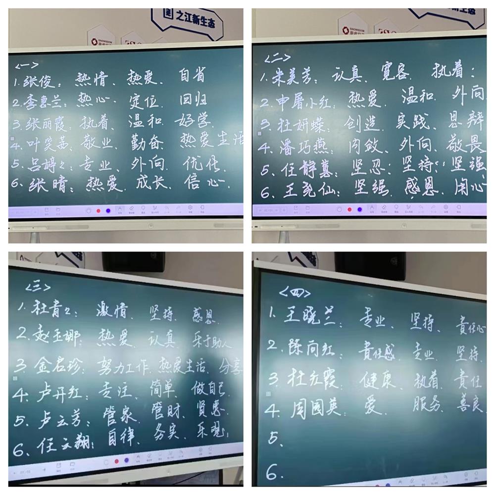 在座各组的每位佳丽轮流上台展示自我,笑意盈盈地介绍公司评价自我,每人引出的三个关键词由工作人员写到黑板上。最后,一致选出每组最热门的关键词,分别是热爱、坚持、乐观和责任。刘院长希望大家用这四个关键词总结成一句有意义的话,话音刚落,昔日东阳中学高材生、杭州设维信息技术有限公司董事长张丽霞就在纸上写下了两句话:“自立而不失坤道,精彩则滋润万物”,大家听后一致认为非常好,同时也为本次“三八”活动划上了圆满的句号。