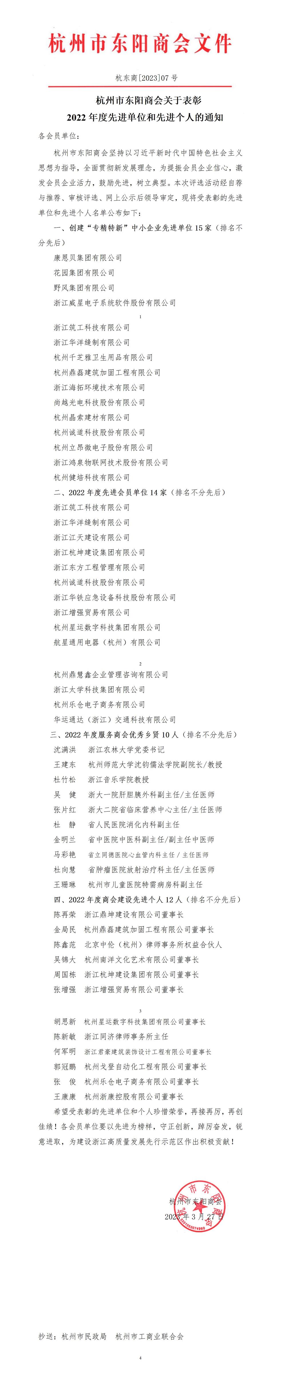 杭州市东阳商会关于表彰 2022年度先进单位和先进个人的通知