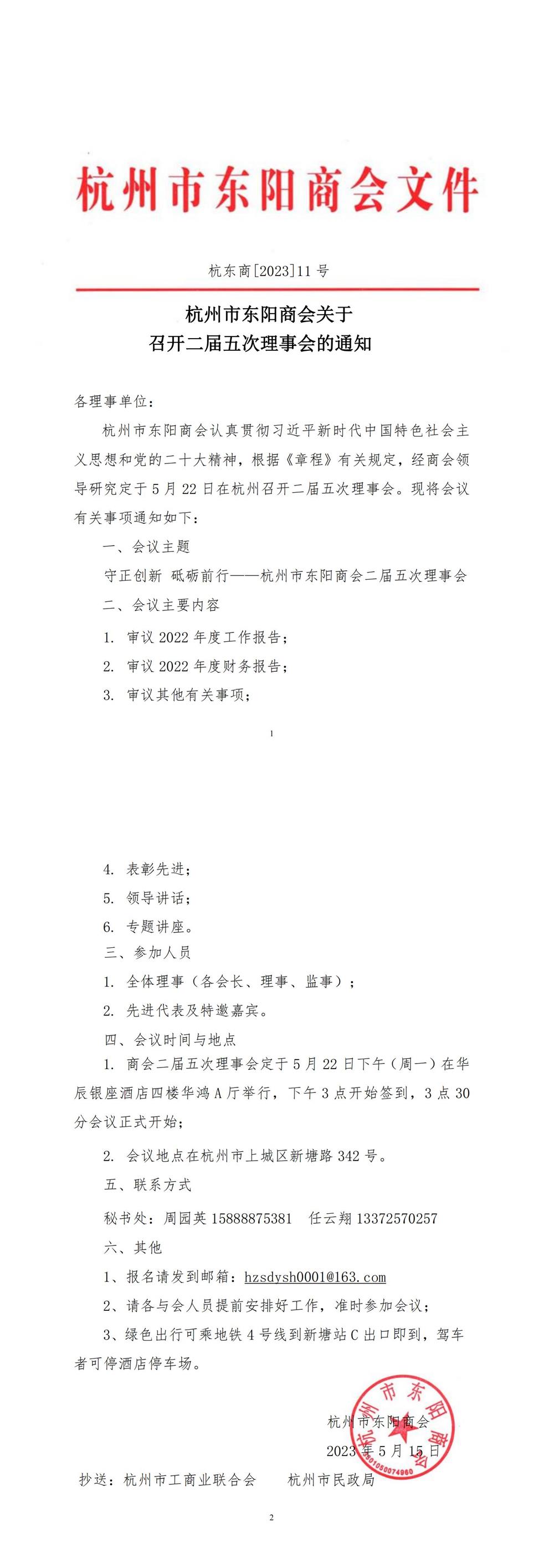 杭州市东阳商会关于召开二届五次理事会的通知