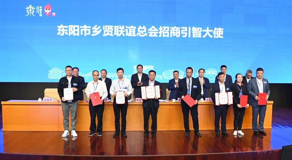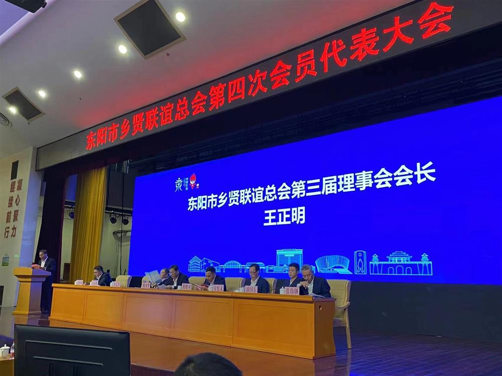 东阳市委副书记、市长黄胜可宣读了市乡贤联谊总会顾问名单。大会选举王正明当选市乡贤联谊总会第四届理事会会长。大会还聘请了9位招商引智大使,本会秘书长李惠兰位列其中。