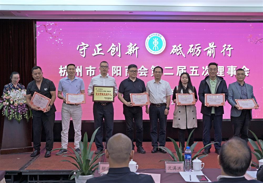 优秀乡贤、浙江农林大学党委书记沈满洪教授为创建“专精特新”中小企业先进单位颁奖;常务副会长俞蘠、王嘉琳分别对商会2022年度先进会员单位和先进个人颁奖;常务副会长朱建星和申屠祖斌分别对荣获东阳市乡贤联谊总会的2021年度和2022年度突出贡献先进个人和先进个人颁奖;商会会长、中天控股集团有限公司董事长楼永良对沈满洪教授等服务商会优秀乡贤颁发奖杯。