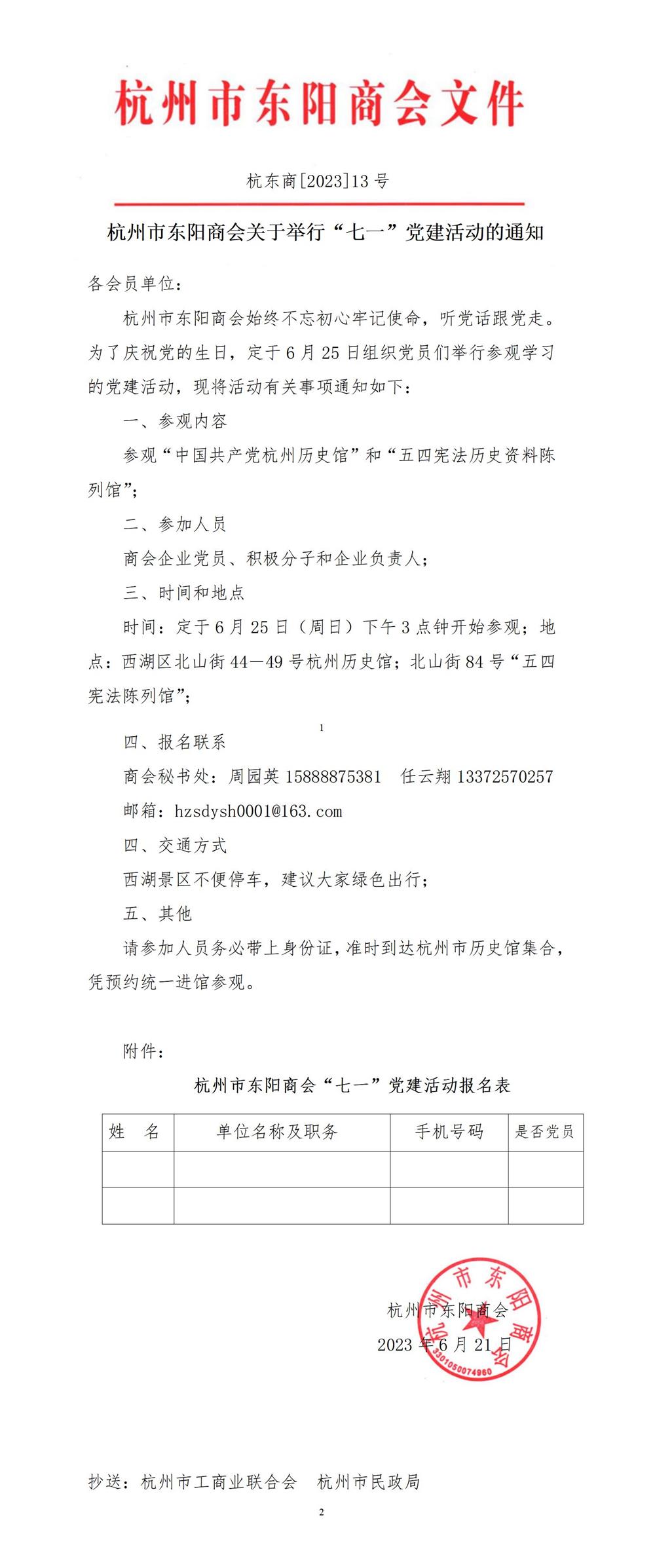 杭州市东阳商会关于举行“七一”党建活动的通知