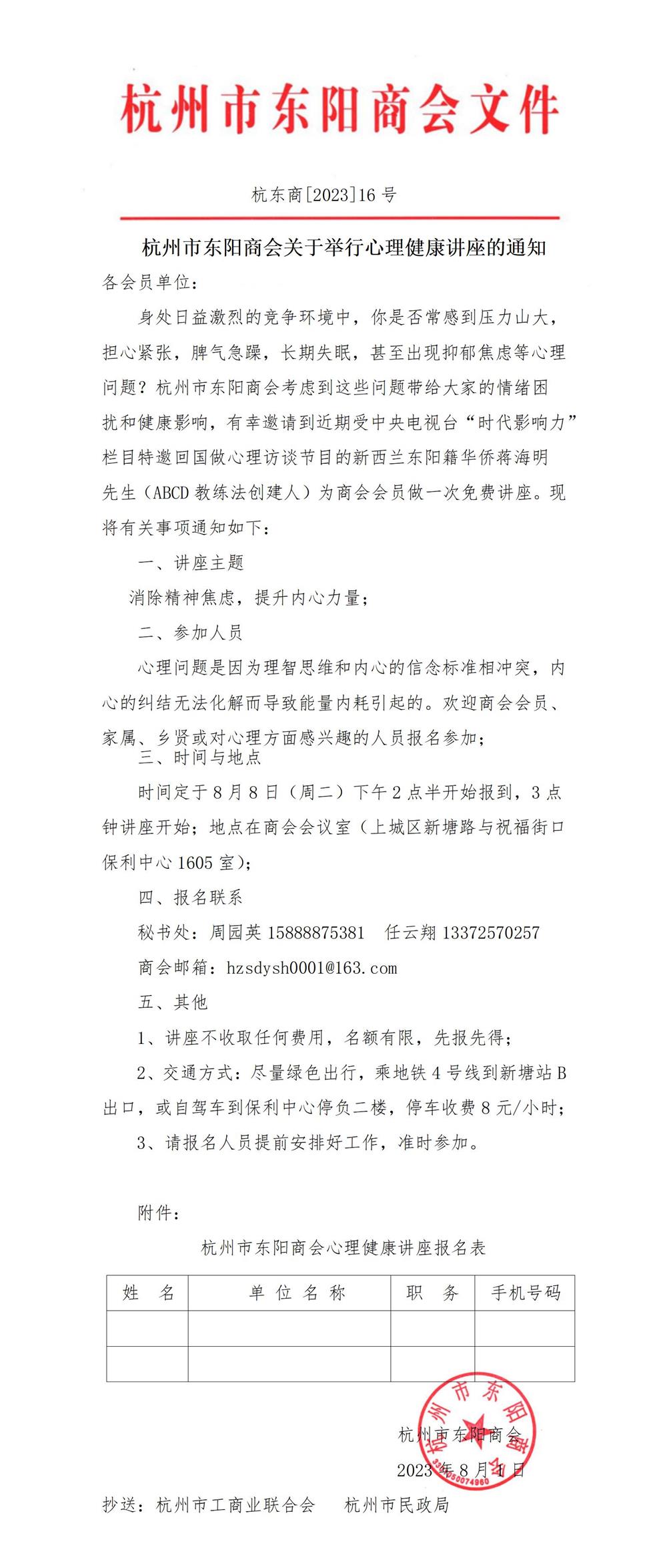 杭州市东阳商会关于举行心理健康讲座的通知