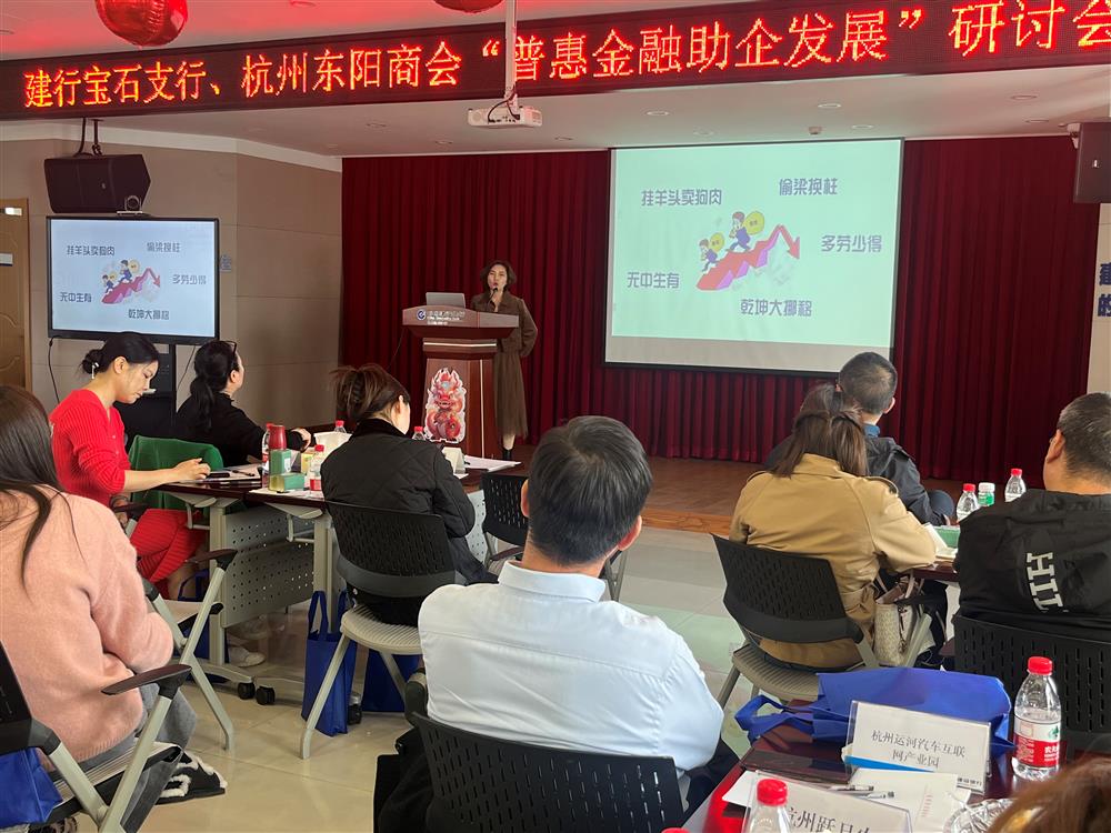 建设银行杭州分行普惠部李嘉经理就普惠金融相关政策及建行产品做了介绍。李嘉首先解读了政府层面普惠金融政策,国务院关于推进普惠金融高质量发展的实施意见当中,提出了我们要优化普惠金融重点领域产品的服务,支持小微企业可持续的发展,要有序推进数字普惠金融的发展,要优化普惠金融发展环境,深化银税互动和银商合作。浙江监管局发布金融高质量服务社会经济发展实施意见提到,各个银行保险机构要差异化的为细分小微企业金融服务,推广连续贷加灵活贷的服务模式,确保在2024年内,浙江省普惠型小微企业贷款的增速不低于各项贷款的平均增速,余额在各项占比当中需要达到25%。另外李经理还介绍了建行包括“专精特新”小微企业专属产品“善新贷”、科技小微企业专属“善科贷”、云税贷、知识产权信用申贷“科技云贷”、纯信用明星产品“快贷”等多种特色产品。最后,她对企业提出的疑问都做出了一一解答。