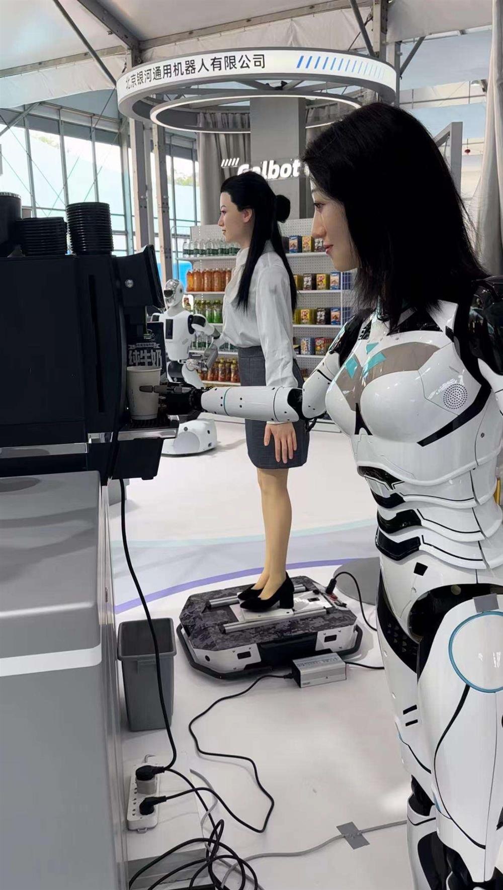 一进场馆,上海清宝引擎机器人有限公司的人形机器人“小惠”正准备就绪,只需喊一句“小惠,小惠,我要一杯拿铁。”小惠便会迅速制作出一杯热拿铁,端到来客面前。