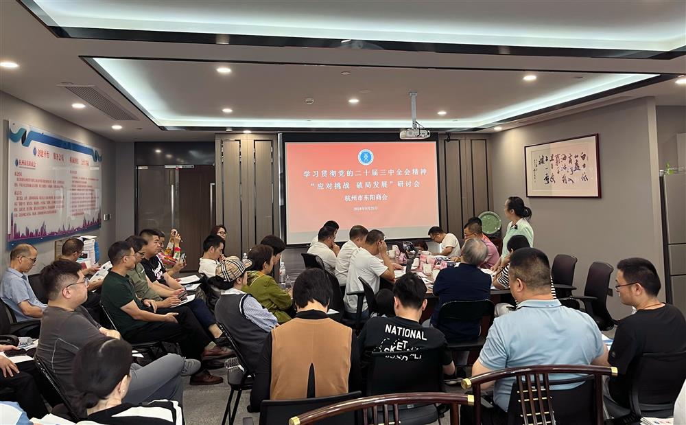 2024年9月25日下午,杭州东阳商会在商会会议室举行了一场主题为“应对挑战 破局发展”的研讨会,旨在深入学习贯彻党的二十届三中全会精神,切实把省委十五届五次全会决策部署贯彻落实到工作实践中,聚焦当前企业面临的经济困境与大环境压力,共同研讨破局之道。研讨会吸引了吴祖跃、金局民、戚山鹰、何军明等副会长、理事、监事、会员等企业的28位老总亲自参加学习,会议室里50多人济济一堂,座无虚席。首先,李惠兰热烈欢迎大家的到来,她说商会自5月份开展“以学促新 提质赋能”行动倡议以来,大家每天早上可参与“盛和早自习”日精进的学习。本次研讨会是实施行动方案《杭东商大讲堂》举行的第一课,这不仅是一个学习的平台,更是一个交流思想、碰撞智慧的舞台。希望通过形式多样的活动,不断激发商会企业的创新活力,促进资源共享、优势互补,共同构建一个学习型、创新型、高效型的商会生态。随后,李惠兰强调了学习党的二十届三中全会、省委十五届五次全会精神的重要性、会议的核心内容和精神实质。理、监事蔡琳红、金局民、戚山鹰等带领大家原原本本地学习了浙江省委十五届五次全会关于“全面学习贯彻党的二十届三中全会精神,进一步全面深化改革,为在奋进中国式现代化新征程上勇当先行者谱写新篇章注入强劲动力”的报告精神。