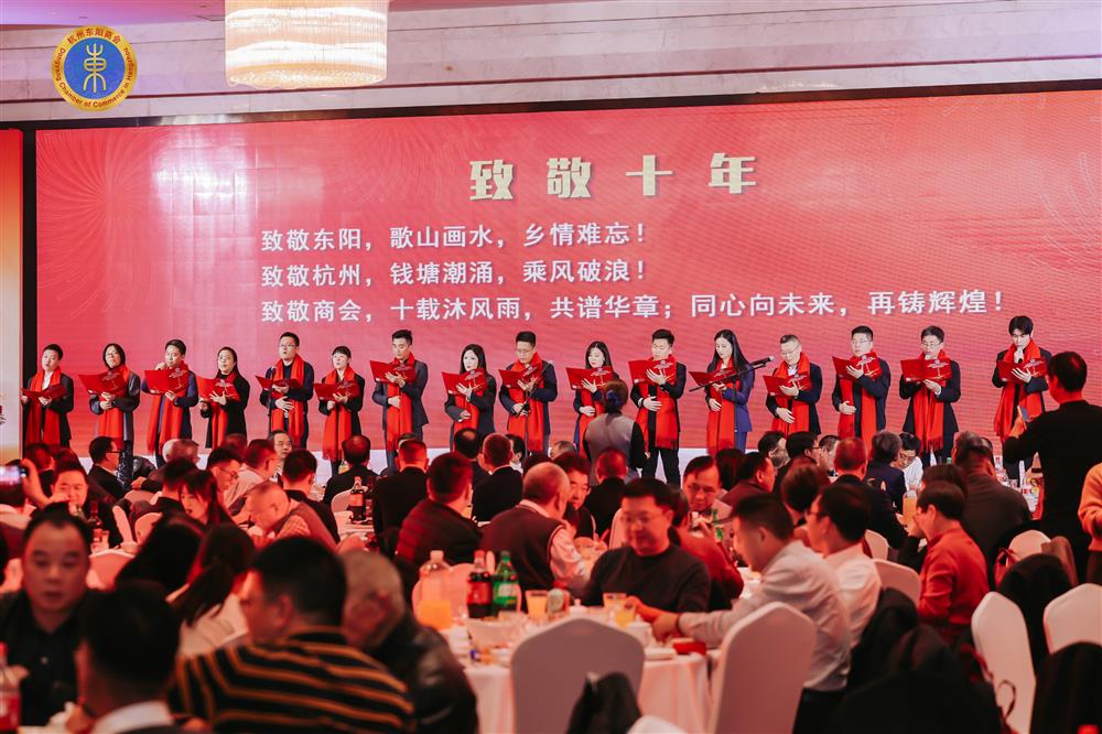 《致敬十年——贺杭州市东阳商会成立十周年》,在16位80.90后商会年轻企业家气势恢宏,铿锵有声的诗朗诵中,庆典晚会拉开了序幕。