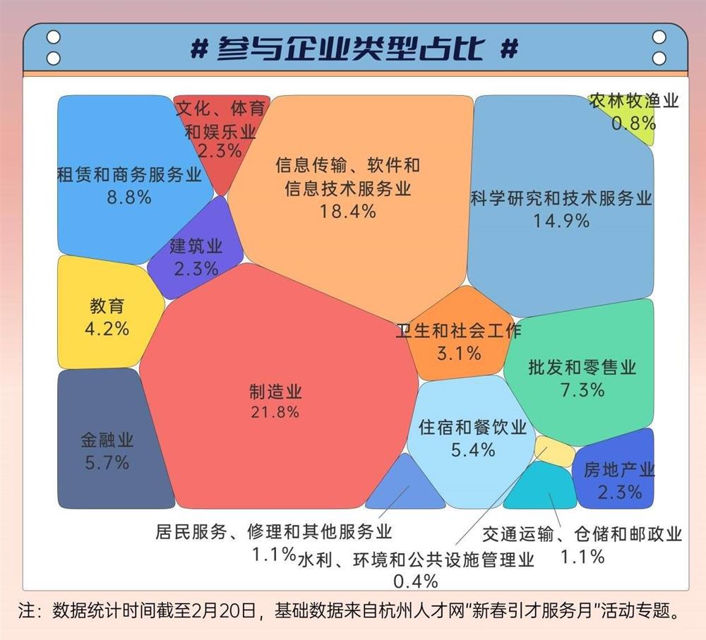 作为开年引才的重要节点,本次“新春引才服务月”的每一场招聘活动都诚意满满,争取满足不同求职者的多重选择。在总计17场招聘活动中,1500余家参会企业累计释放优质岗位超2600个,人才需求总量突破3.5万人。观察发现,制造业、互联网及科创企业,可谓是系列招聘会中的“三巨头”,参与企业数量占比超五成,“租赁和商务服务业”“批发和零售业”紧随其后,分别占比8.8%和7.3%。