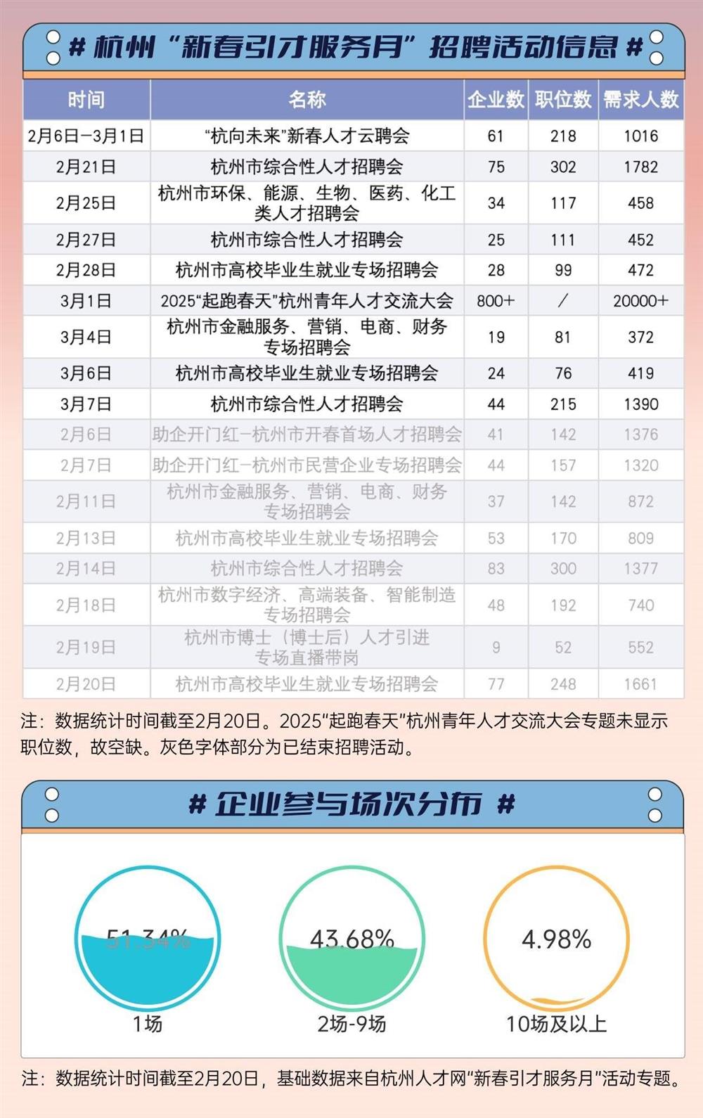 软硬件综合开发工程师、外贸运营专员、招商运营专员……2月20日9时至12时,杭州市高校毕业生就业专场招聘会在杭州市人才市场举行,77家参会企业累计提供248个岗位和1661个用人需求。以这场招聘会为代表,今年春节假期后,杭州启动“新春引才服务月”活动——2月6日至3月7日,杭州市级层面平均每2天就有1场招聘活动。