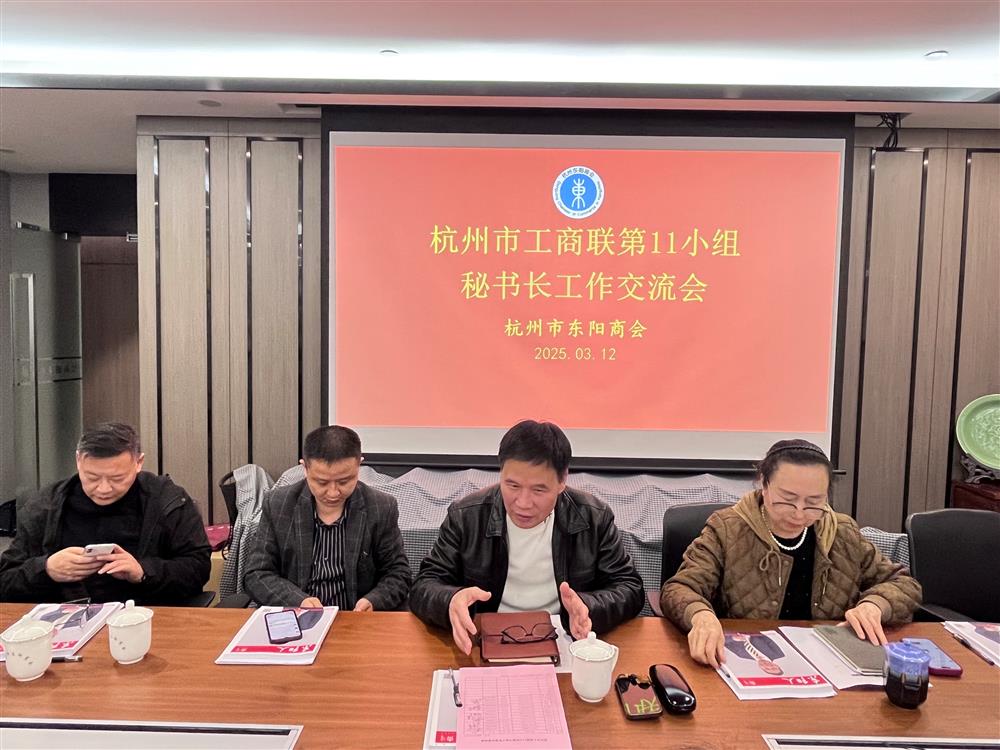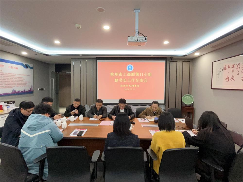 3月12日下午,杭州市工商联第11小组秘书长工作交流会在杭州东阳商会会议室举行。来自杭州市永嘉商会、广西商会、徐州商会、阜阳商会、临海商会、乐平商会、安吉商会、鹿城商会、白山商会、临沂商会等秘书长共14人参加。会议由第11小组组长、杭州市永嘉商会秘书长董伯良主持。