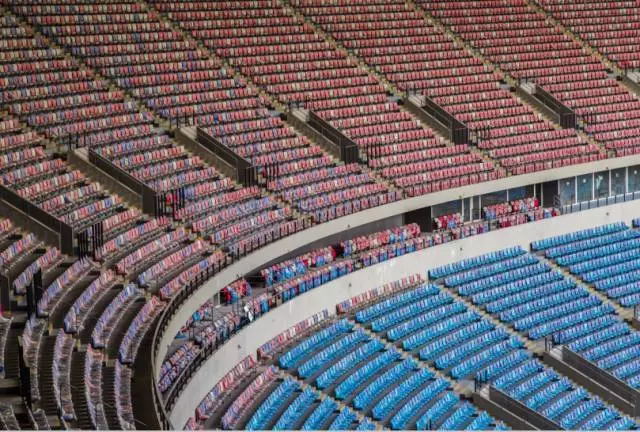 而看台上座椅的颜色,跟其他体育场也不一样,有红色紫色灰色浅蓝深蓝五种,但不是按区域来分的,而是相互穿插渐变的。