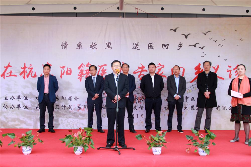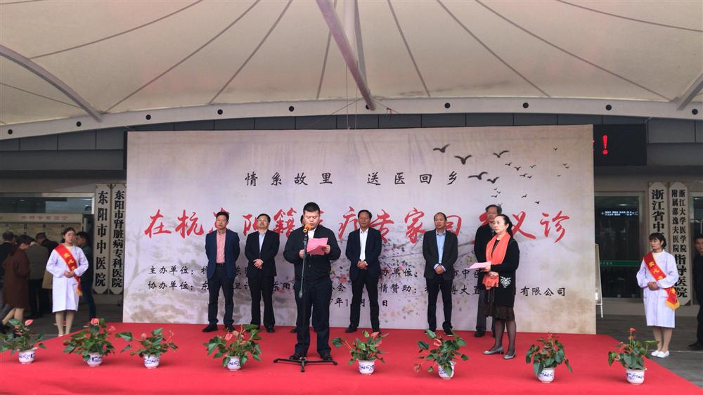 杭州东阳商会执行会长、歌山建设集团总裁何向全致辞:他说不管岁月怎么流逝,我们在外工作、经商的东阳人永远不会忘记养育我们的东阳故乡,也始终惦记着东阳的家乡父老。这正是我们杭州东阳商会举办本次义诊活动的初心。根据与东阳中医院学科对接的需要,得到了各学科16位医疗专家的积极参与,有的专家推掉了其他医院的邀请会诊而回到家乡义诊。这就是我们在外东阳人情系故里、回报家乡的心情写照。杭州东阳商会会长、中天控股集团董事长楼永良先生对这次义诊活动也高度重视,虽然因公出国在外不能出席,但也专门发来了贺词——“名医义诊,德行天下!”